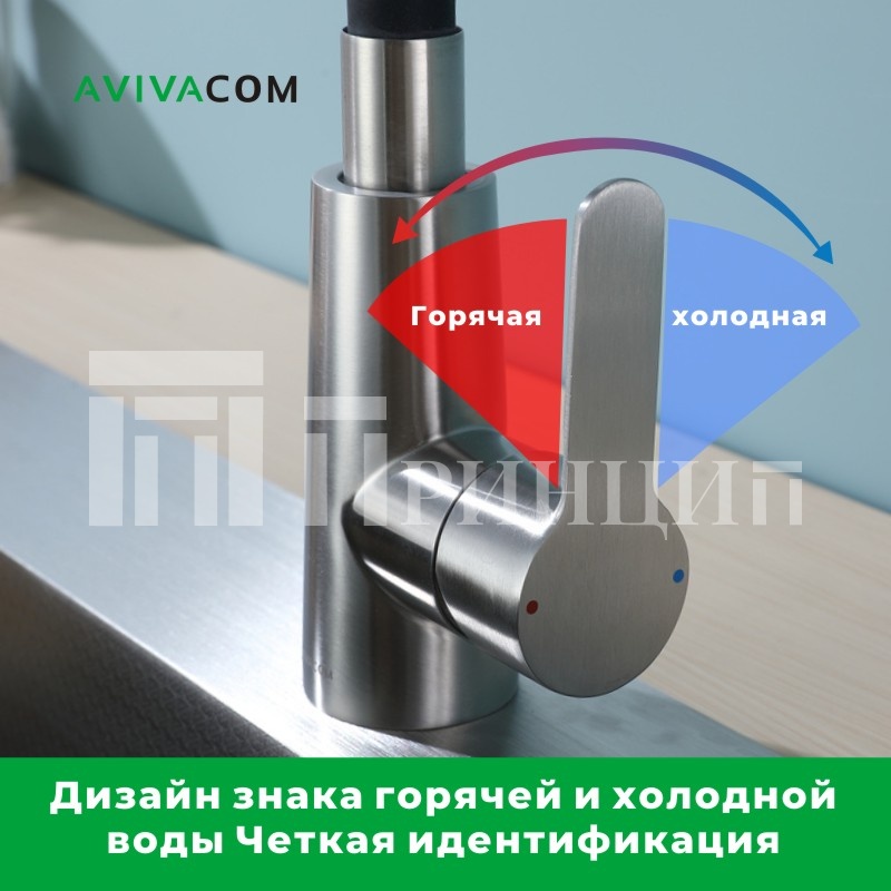 Гибкий упругий излив упрощает мытье посуды и продуктов, а сатиновое покрытие придает смесителю утонченный и элегантный вид, гармонично дополняя любой интерьер.